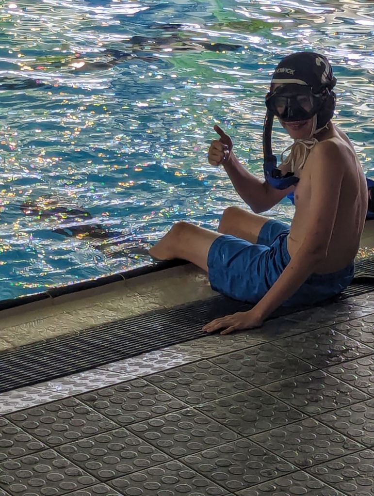 That’s how we found ourselves at a pool 30 min away watching a pool full of snorkelers swim around and periodically dive underwater. It is not a sport for spectators, lol. You can only imagine what might be going on under the water from the view of the surface. I could only tell it was Charles by the number on his cap. Apparently it is great for the kids because they don’t have to deal with yelling parents on the sidelines. The aim of the game is to use a little curved stick to hit the puck into a metal lipped goal that sits on the bottom on each side of the pool. The sticks are either white or black depending on your team so you can surmise who is who underwater. Charles had a two hour go at it. He spent most of the time at the surface looking underwater. He told me excitedly how he managed to hit the puck once during a scrimmage, only to have it intercepted and the other team scored, lol. He said underwater hockey is not his thing, but he is glad he tried it. We are too!