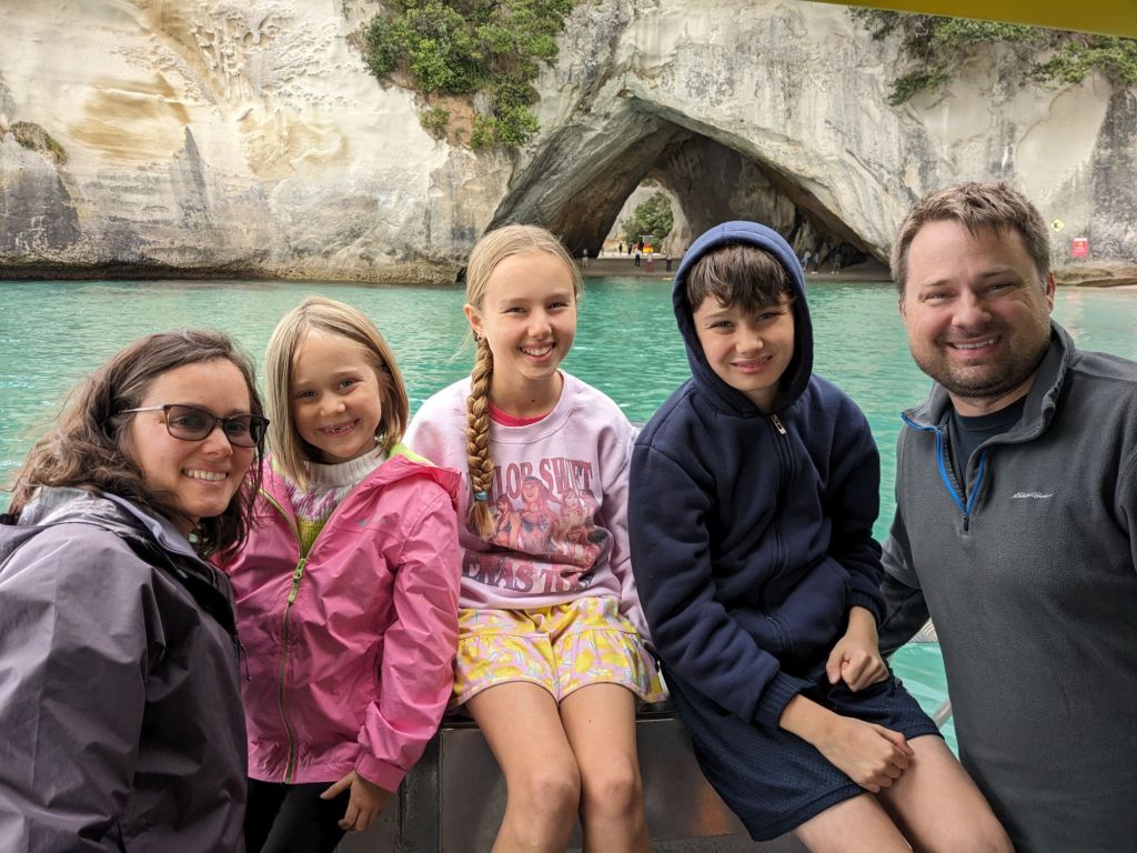 Some poor planning on my part meant that there wasn’t much to see the next day near where we were staying. So at the last minute we booked a glass bottom boat tour on the other side of the peninsula at Whitianga, an hour away. This meant traversing many more winding roads where it was hard to go much faster than 50km/hr yet the speed limit signs still read 100. I really enjoyed the boat tour and Cathedral cove- pics and highlights below. The area is a long-standing marine sanctuary so there were lots of fish to view through the glass bottom of our boat. So cool! Not far from the boat tour, I had read about a place called Hot Water Beach- where the geothermal heat lies just beneath the shore so people can dig in the sand creating their own self-made hot tubs. This can only be done two hours each side of low tide and unfortunately for us, the low tide was set to occur at 9pm. This meant another late night. We would be driving back over an hour to our place on the winding roads in the dark again. I was pretty anxious- would this turn out to be a flop? Would even be able to find the beach and figure out what to do? Would it be too cold at 50 degrees F? etc. But at least three of us were excited (majority rules) so we decided to hang around till after dinner. At 7pm, in the winter darkness, we followed our GPS and later some inconspicuous signs to Hot Water Beach where we found an unpretentious area with a nearly empty parking lot and a building of toilets and changing rooms. We put on our togs (aka bathing suits) and then without a soul in sight and only the light of one phone to light the way, we carried our shovel and towels down to the beach. One website mentioned we were supposed to dig near some large rocks but we couldn’t see anything in the dark, could only hear the ocean some ways ahead of us. Luckily there were some lights from people about 100 yards to the left of us so we headed in that direction hoping for the best. There, to my relief, we stumbled upon a few other people with the same intentions as us, including a couple relaxing in their shallow sandy hot tub. They reassured us of our plan. We could feel the hot spots in the sand beneath our feet and had a sense of where the heat was coming from. We picked a spot a few feet away and started digging, well Danny started digging with us intently watching and holding the phone so he could see. The kids were eager to get warm and so jumped in once it was a few inches deep. After 10-15min more of digging, we were all laying down, side by side, half submerged. The water was nice and warm and treasured with the cool air around us. With eyes on the blanket of stars above us, listening to the gentle rhythm of waves against the shore, we all marveled at the absurdity of the experience and soaked it in for an hour or so. While we were there, a few others with shovels in hand came, digging a spot of their own, although the darkness obscured our vision and it was easy to forget that we weren’t alone out there.