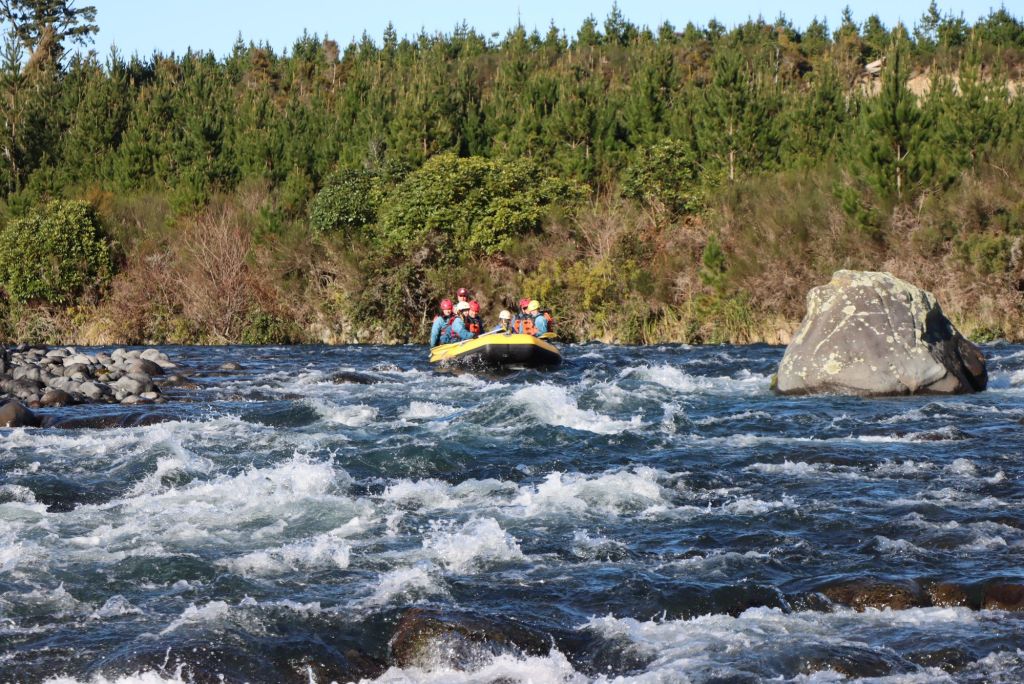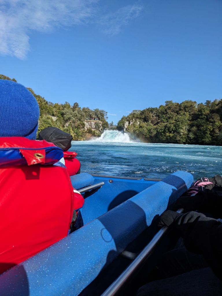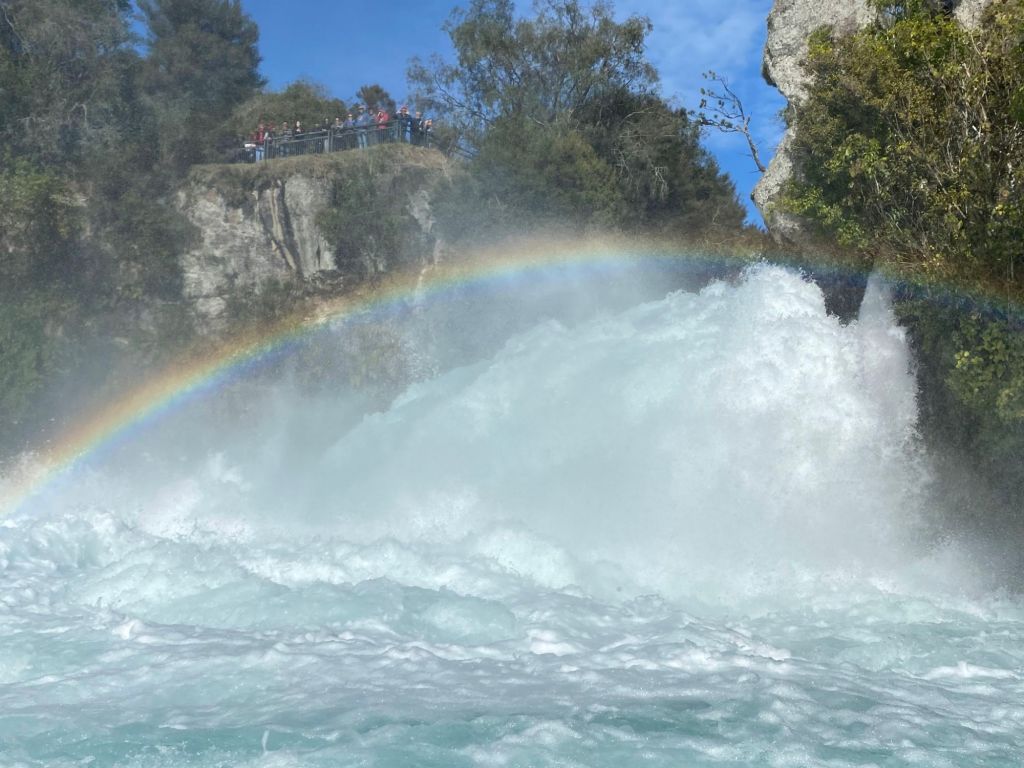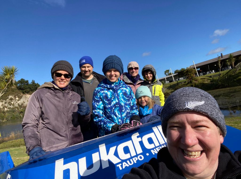 Right after NZ school term finished, we left for Taupo, a town on New Zealand’s largest lake. Taupo is about 3-4 hours south of Auckland on the North Island and a popular vacation spot for Aucklanders.  Here the 7 of us spent a few days partaking in some quintessential NZ activities- white water rafting, jetboating, and hot springs. While we had done jetboating before, we were impressed with boating up to the Huka Falls, arguably New Zealands most visited natural attraction. Not quite on level with Niagara Falls but the display of water power as the wide river becomes quite narrow is impressive and when it comes with a rainbow, near magical. Thankfully our white water rafting trip stayed clear of the falls. Traversing multiple grade 2 rapids on a different river (Tongariro R.) was thrilling enough for most of us I think. Also in Taupo, Charles got his month-long dream smashed when he was unable to win $10,000 by hitting a golf ball onto a platform on the lake (Hole-in-one challenge). For the dog lovers of our group, we took a husky dog sled racing tour with the overriding message-  huskies are amazingly built for sled racing but poorly suited as pets. We all appreciated getting to interact and pet the beautiful and gentle domesticated “wolves.” Lastly, we squeezed in some relaxing time in a natural hot spring pool (DeBretts).